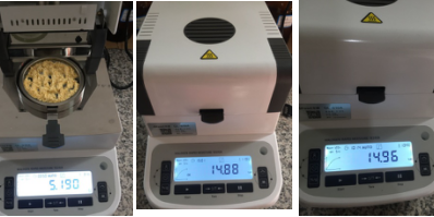 測試樣品1:用實(shí)驗(yàn)藥勺提取5.1克飼料,置于不銹鋼托盤中,用實(shí)驗(yàn)藥勺將飼料平鋪均勻,溫度設(shè)置135℃用儀器進(jìn)行加熱,約10分鐘后檢測結(jié)束,檢測數(shù)據(jù)顯示14.96%;