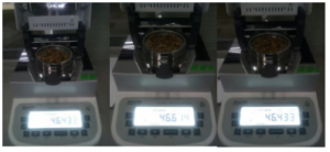 - 復位儀器,待儀器冷卻至40℃以下后,再取4.5g左右酒糟(93/94)均勻鋪在樣品盤上,重復上述測試步驟;測試結束后得出第二組數(shù)據(jù),顯示樣品的水分含量為433%;