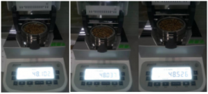 - 用實驗勺取3g酒糟(93/94)均勻鋪在樣品盤上,設置好合適的溫度后蓋下上蓋,按下“START”鍵開始測試;蜂鳴兩聲后,儀器自動停機,測試結束,可在液晶顯示屏查看測試后酒糟的水含量為46.433%;