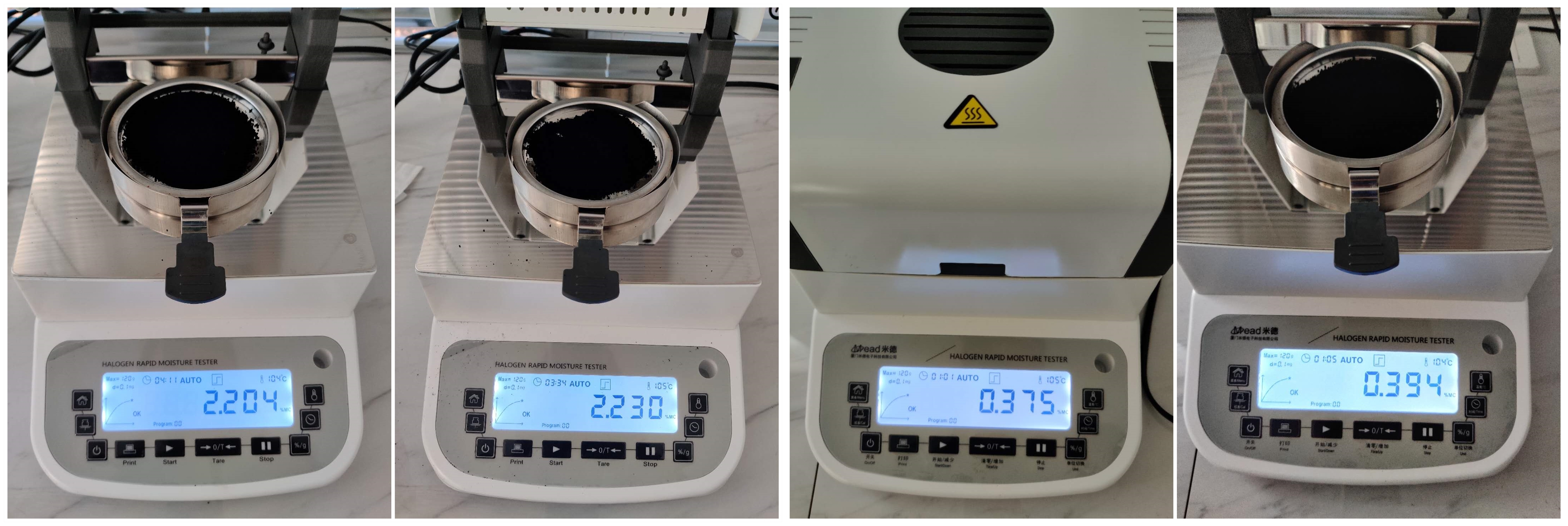 - 用樣品勺取適量充分暴露在空氣中的碳黑粉末均勻鋪在樣品盤(pán)上,設(shè)置好合適的溫度后蓋下上蓋,按下“START”鍵開(kāi)始測(cè)試;蜂鳴兩聲后,儀器自動(dòng)停機(jī),測(cè)試結(jié)束,可在液晶顯示屏查看被測(cè)粉體的水分含量為2.204%;