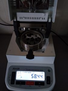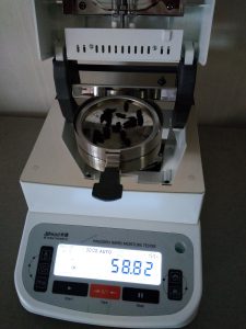為了得到更精確穩(wěn)定的數(shù)據(jù)結(jié)梅,在進(jìn)行第二次測(cè)試過(guò)程前先等待話梅干水分儀降溫,待儀器本身溫度降至40度以下時(shí),同樣取3克話梅干碎于不銹鋼托盤(pán)中,將話梅干碎平鋪均勻,這次我們把溫度設(shè)定在160℃,按“START”鍵開(kāi)始測(cè)試,30分08秒后檢測(cè)結(jié)束,檢測(cè)數(shù)據(jù)顯示58.82%;