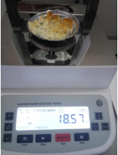 - 為了得到更精確穩(wěn)定的數(shù)據結果,在進行第二次測試過程前先等待面包水分儀降溫,待儀器本身溫度降至40度以下時,同樣取5克面包碎屑于不銹鋼托盤中,將面包碎屑平鋪均勻,這次我們把溫度設定在120℃,按“START”鍵開始測試,5分26秒后檢測結束,檢測數(shù)據顯示18.34%;