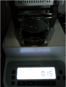 第一次,因樣品3屬金屬粉末,密度較大,取10克樣品3#粉末,置于不銹鋼托盤中,用鑷子將金屬粉末平鋪均勻,溫度設(shè)置110℃用儀器進(jìn)行加熱,定時5分鐘后檢測結(jié)束,檢測數(shù)據(jù)顯示0.15%;