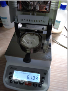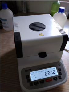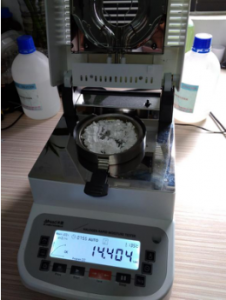 • 測試混合淀粉:為了使測試過程中混合淀粉水分儀將混合淀粉烘干烘透,我們將混合淀粉攤成分散狀,以便溫度能滲透進去。取5克左右混合淀粉末置于不銹鋼托盤中,用鑷子將混合淀粉末平鋪均勻,為避免混合淀粉烘烤后變焦,我們將溫度設(shè)置在135℃,按“START”鍵開始測試,7分55秒后檢測結(jié)束,檢測數(shù)據(jù)顯示14.404%;