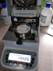 • 為了得到更精確穩(wěn)定的數(shù)據(jù)結(jié)果,在進行第二次測試過程前先等待混合淀粉水分儀降溫,待儀器本身溫度降至40度以下時,同樣取5克左右混合淀粉末于不銹鋼托盤中,將混合淀粉末平鋪均勻,這次我們把溫度設(shè)定在135℃,按“START”鍵開始測試,8分23秒后檢測結(jié)束,檢測數(shù)據(jù)顯示14.426%;