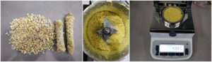 2、將大米用粉碎機打成粉末狀,再均勻平鋪在托盤上,擺放時放入約5g左右,切勿用力觸碰樣品托盤。