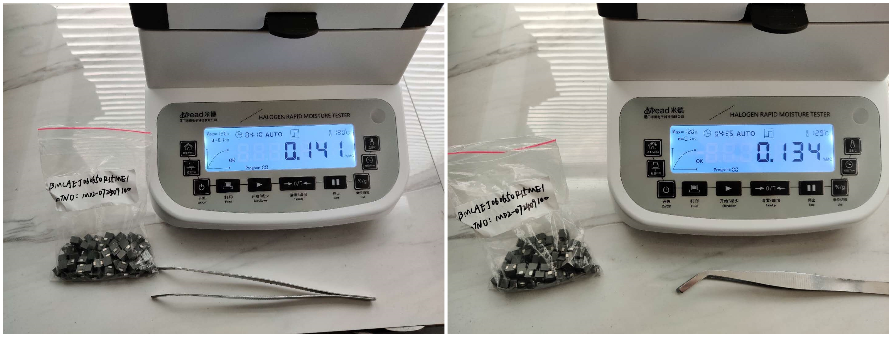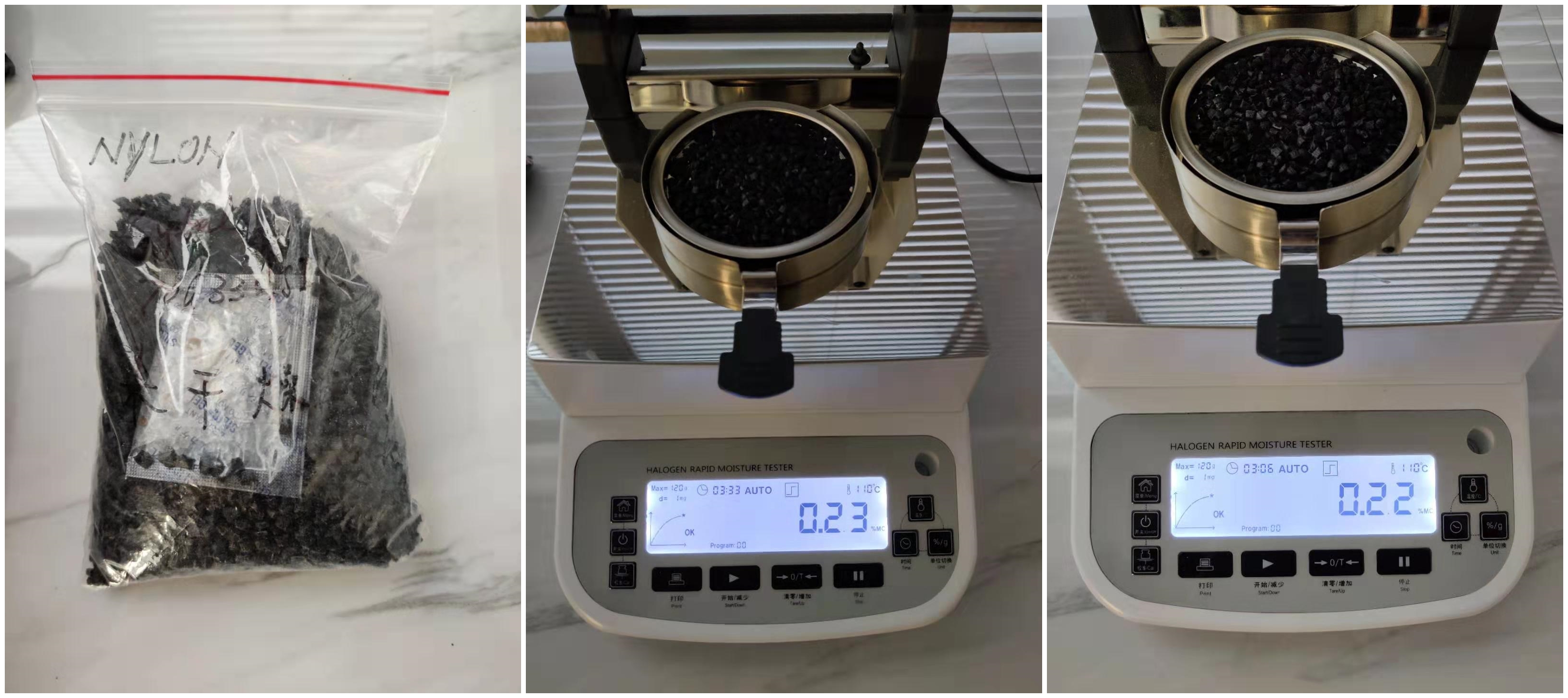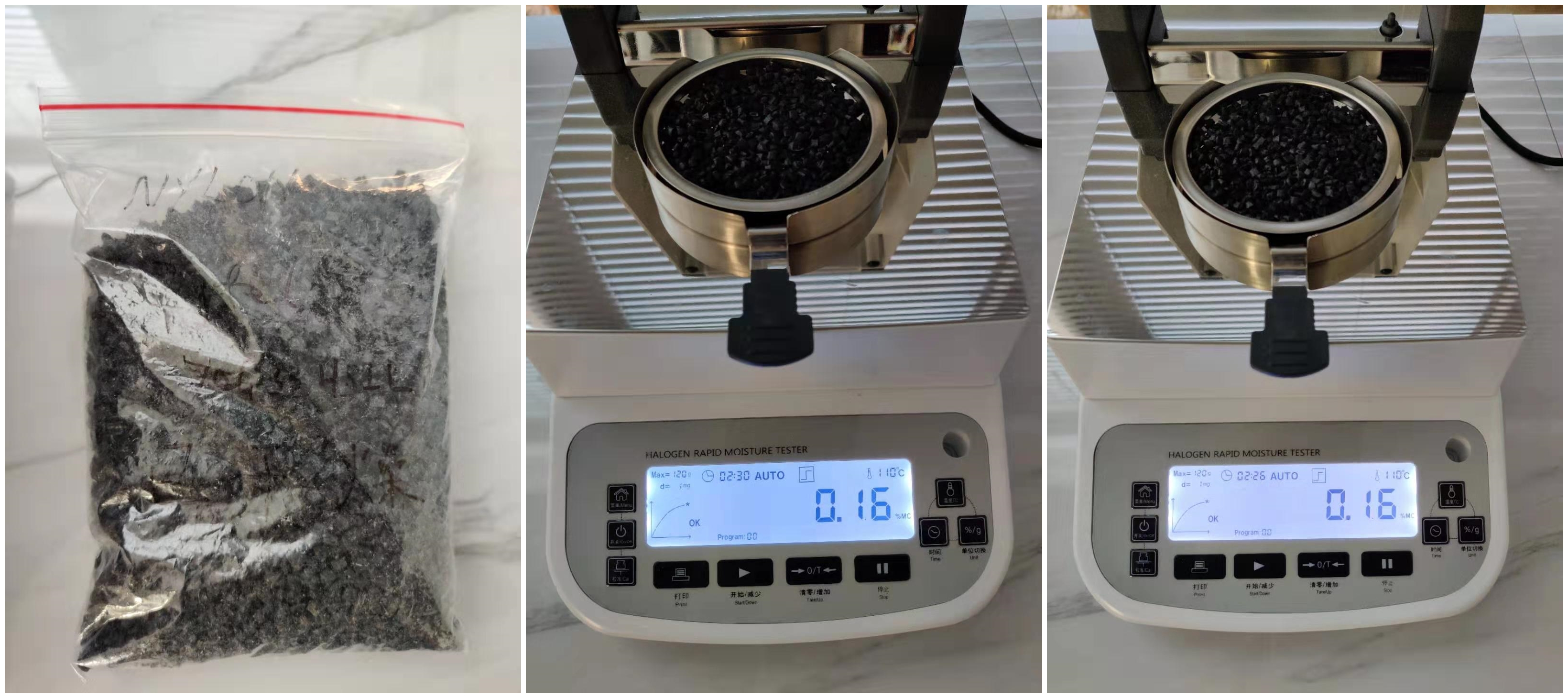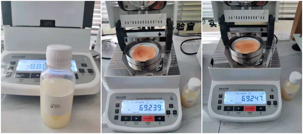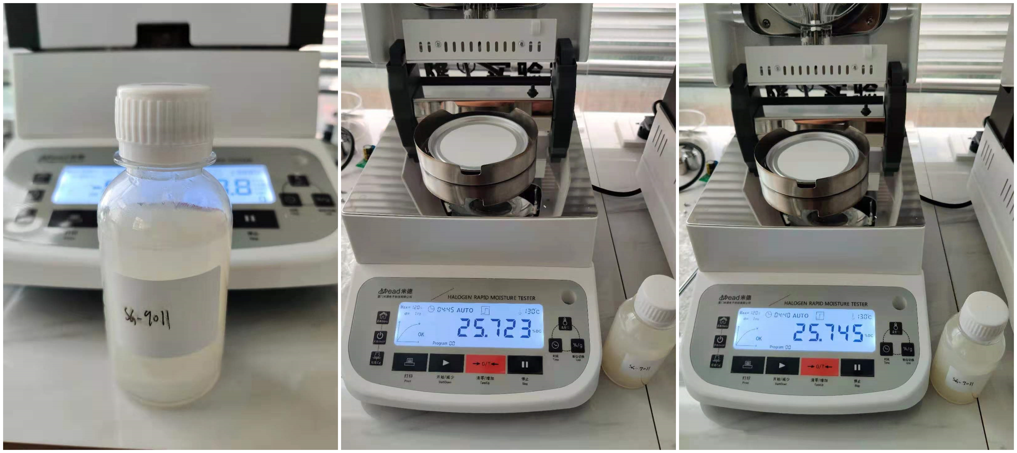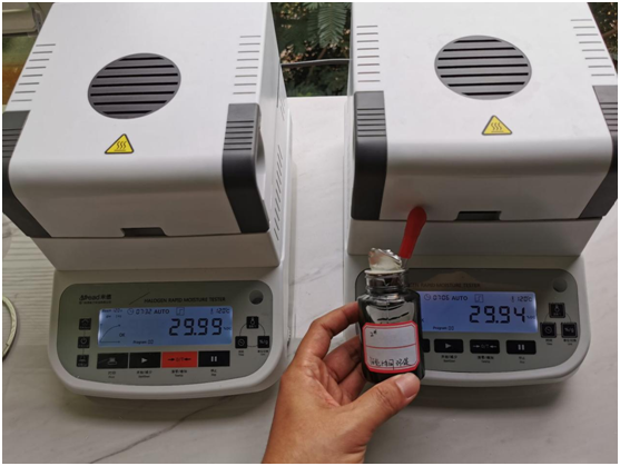 4.10、將裝有樣品的樣品瓶放入加熱孔中,插入空芯針,在水分測定儀上輸入樣品重量,調(diào)整延時(shí)時(shí)間,同時(shí)水分儀上開始測量。在屏幕上點(diǎn)方法,并且在方法中輸入樣品稱重質(zhì)量,等待測量完成顯示最終含水量結(jié)果。