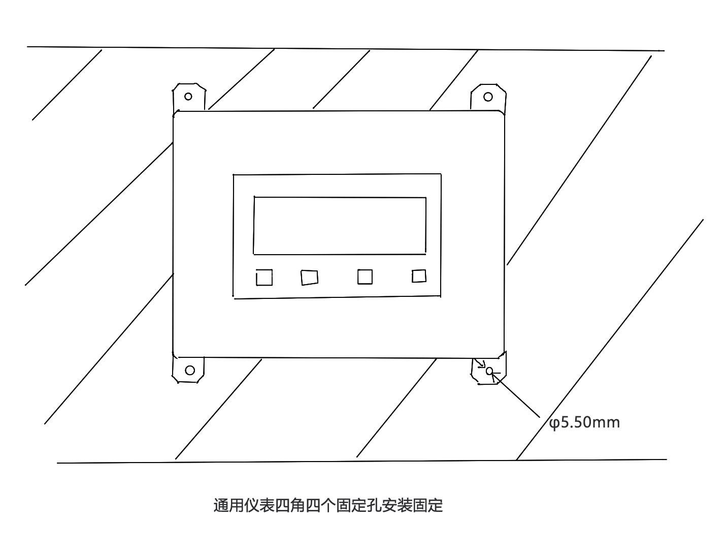 儀表可以通過四角四個固定孔進(jìn)行安裝固定,安裝在墻面或者生產(chǎn)儀表設(shè)備上,例如可以安裝在生產(chǎn)設(shè)備槽鋼支架上。